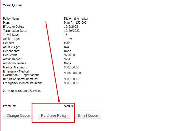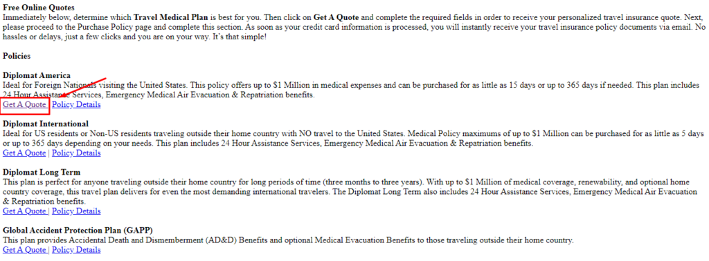 После перехода на сайт компании вы увидите несколько абзацев, нажимаем на словосочетание Get A Quote  под названием полисы Diplomat America так как показано на изображении ниже